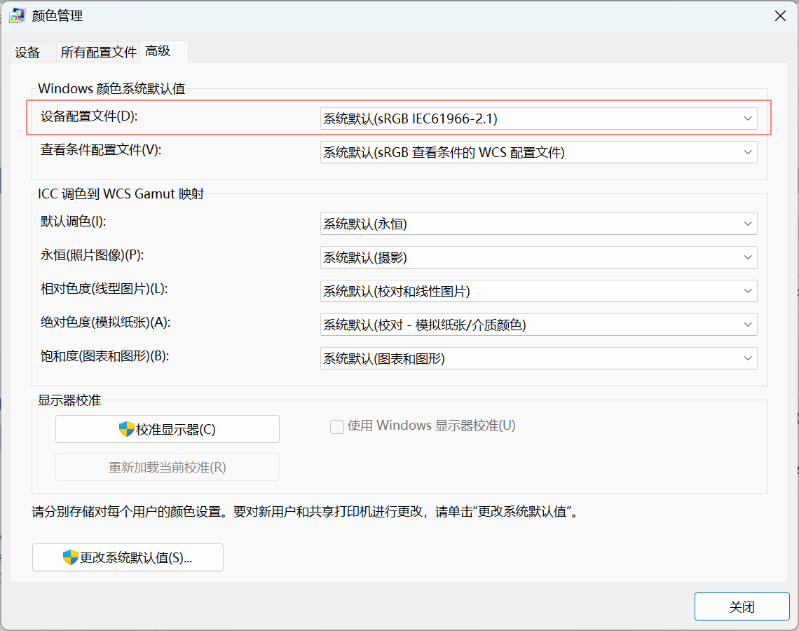Windows 11 中 颜色管理---高级 选项卡 Windows颜色系统默认值 设备配置文件(D): 系统默认(sRGB IEC61966-2.1) Agfa : Swop Standard Samsung U28E590D scRGB虚拟设备模型配置文件 sRGB IEC61966-2.1 SRGB虚拟设备模型配置文件 系统默认(sRGB IEC61966-2.1) 详细说明