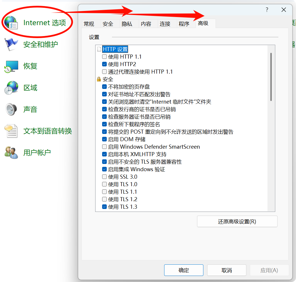 "Internet 选项"(Internet Options)是 Windows 操作系统中的一个重要设置功能,通常用于配置与网络浏览、连接和安全相关的各种选项。它允许用户管理浏览器设置、连接设置、隐私和安全设置等。Windows 操作系统中的 “Internet 选项 - 高级” 选项卡,主要用于配置一些高级网络设置,比如浏览器的行为、JavaScript、SSL/TLS 安全性、代理设置等。