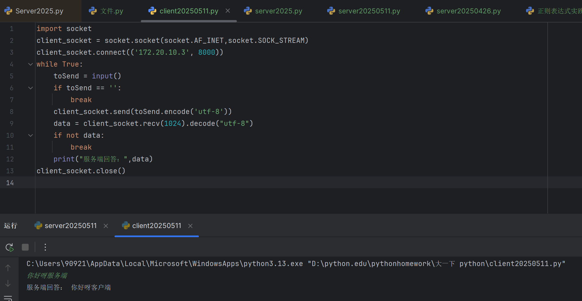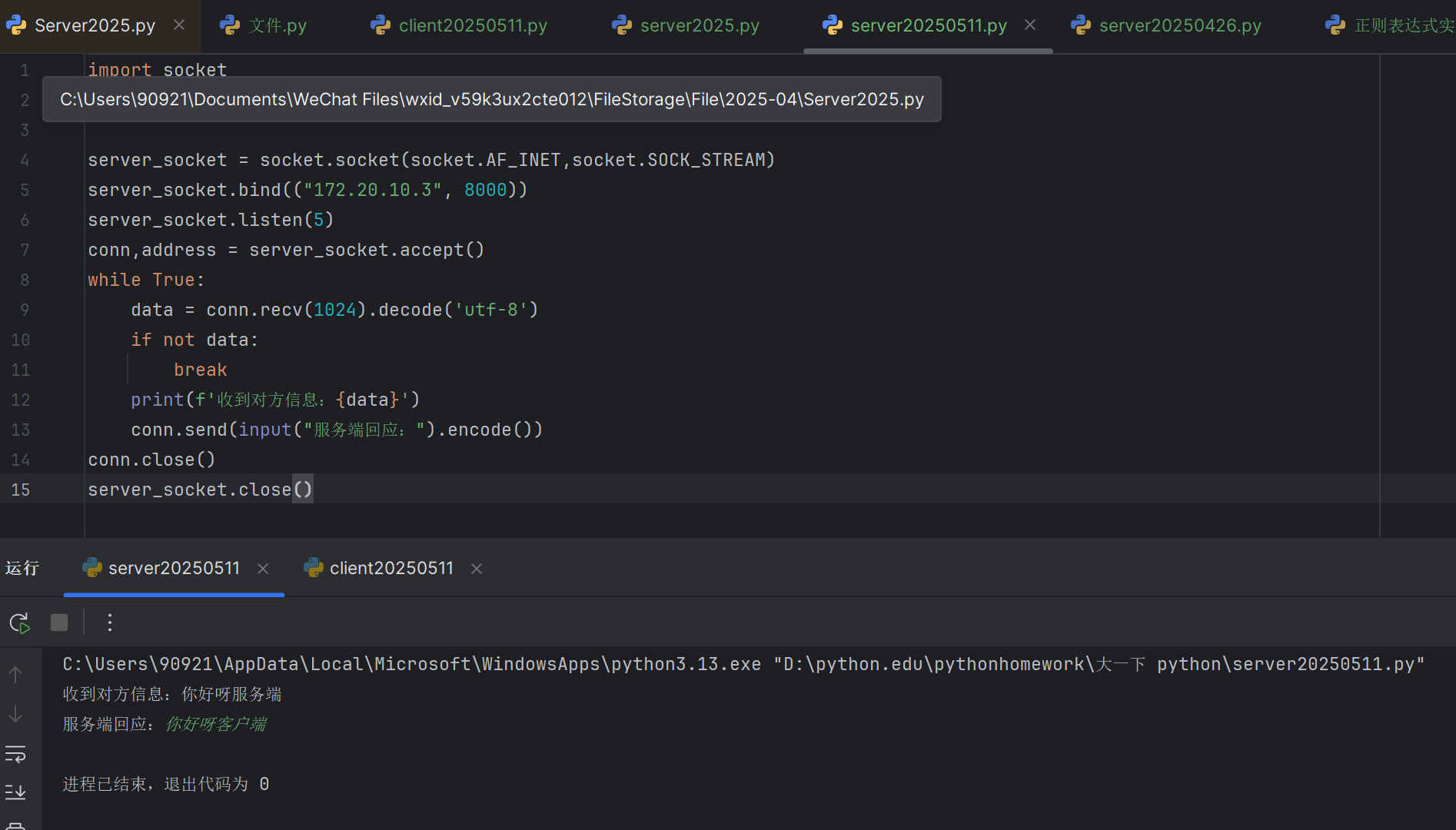 (1)创建服务端和客户端,选择一个通信端口,用Python语言编程实现通信演示程序;