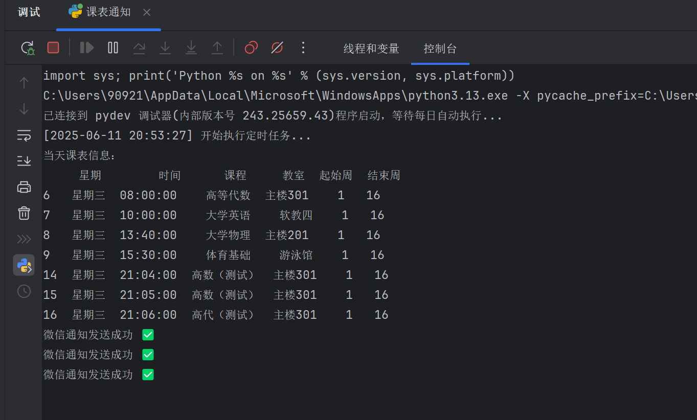 鉴于每次赶着上课前想打开云校查看下节课的教室时云校总是出现卡顿的问题,十分令人着急,所以设计了这个程序每日自动从课表中读取上课时间和教室,并提前十分钟发送微信信息提醒,方便我在上一节课下课后打开微信就直接知道下一节课要前往的教室,节省了不必要的时间开销,同时也能避免忘记有课的情况。