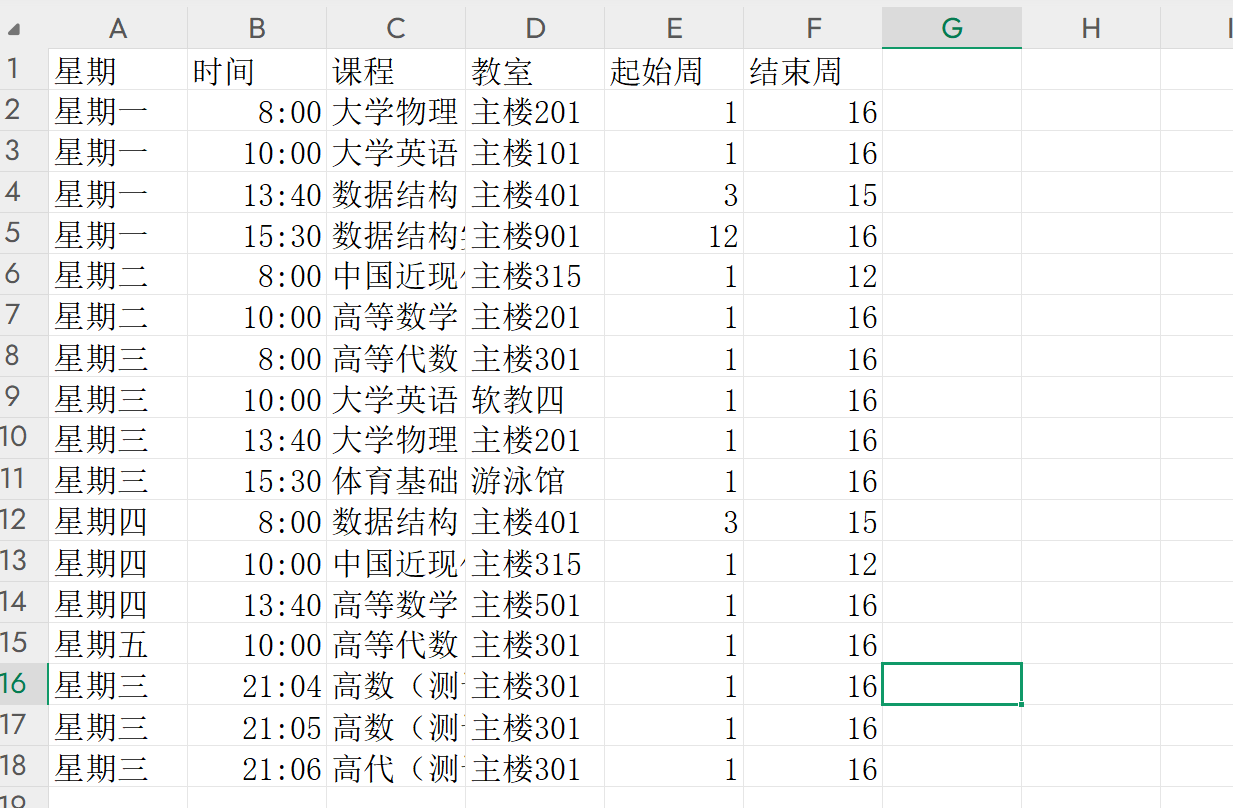 1.将课表详细汇总至excel表格中,包括星期、课程、教室、起始周、结束周信息