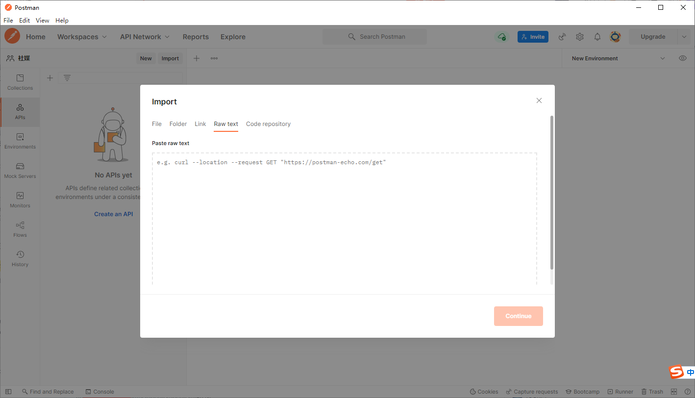 2、打开postman,左上角点击file-import,选择Raw text,粘贴即可