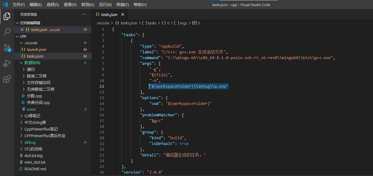 task.json 的参数负责vscode编译参数,设置:args参数的-o参数后面,修改为:"${workspaceFolder}\debug\a.exe"