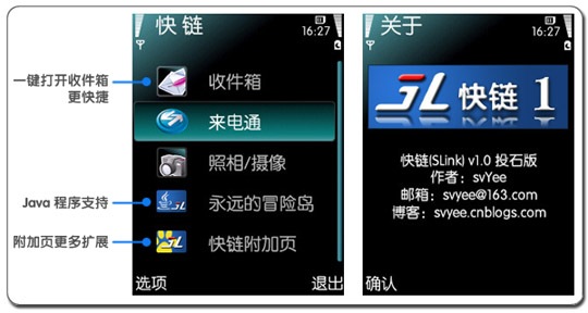 『功能介绍』:快链(SLink) v1.0 投石版,是基于 symbian 系统的简单实用的“开始”菜单。最多可以设置24个已安装程序的快捷方式,支持收件箱链接,并与数字键0~9,*、#键绑定,设置好之后,点击相应的快链选项,或直接按数字键就可以运行指定的程序。