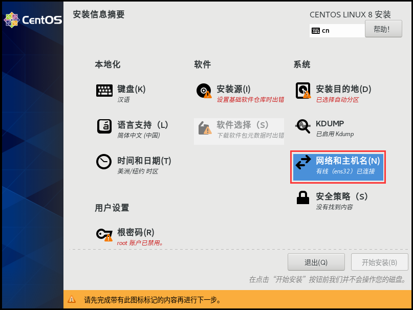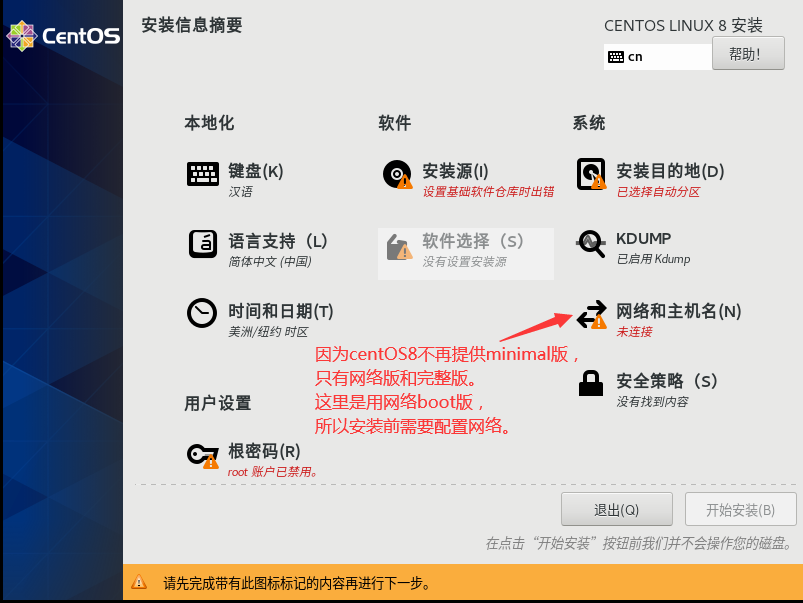 因为centOS8不再提供minimal版,只有网络版和完整版。这里是用网络boot版,所以安装前需要配置网络。