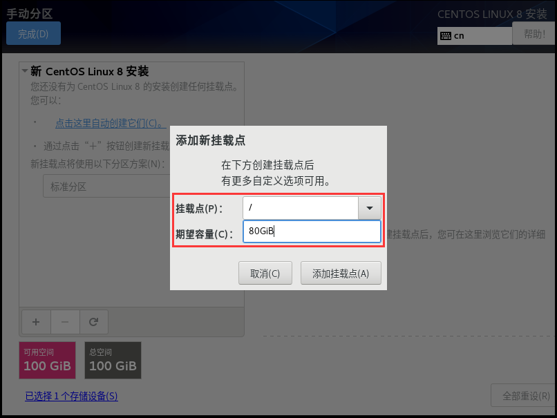 +添加挂载点/(容量如果不填写,则将全部剩余可用空间分配此挂载点)
