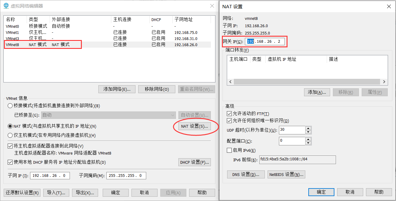 设置虚拟机网络:从菜单【编辑】->【虚拟网络编辑器...】