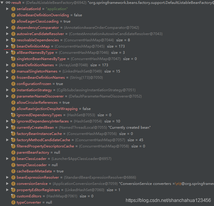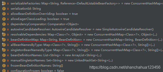 DefaultListableBeanFactory的部分成员变量。