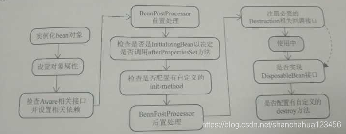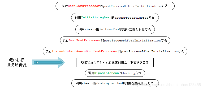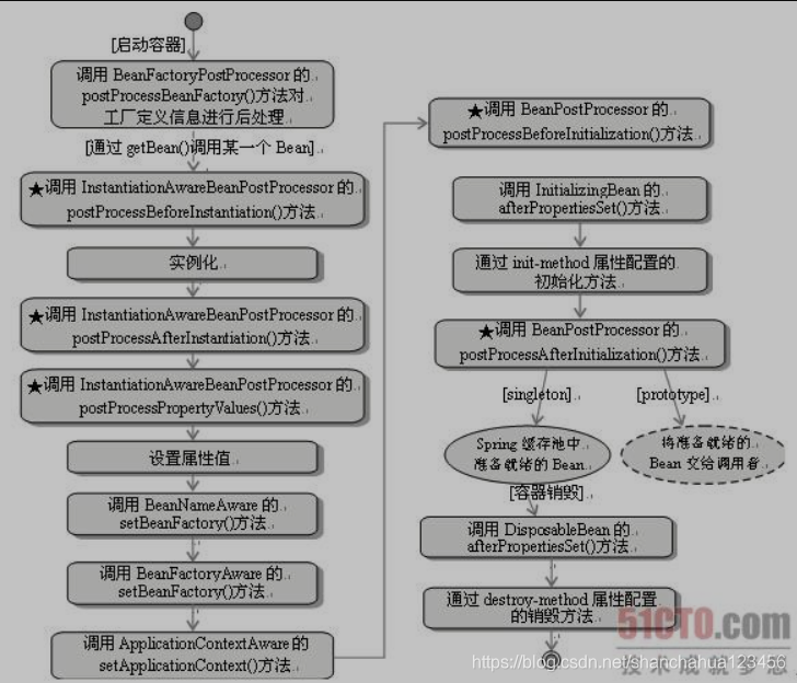 下图可见:Spring Bean的完整生命周期从创建Spring-IoC容器开始,直到最终Spring容器销毁Bean
