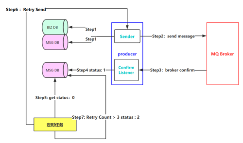 Step 6:最大努力尝试次数,需要有一个定时任务,把超时仍然处于中间状态的消息进行重新投递。(比如每5分钟拉取一下处于中间状态的消息,当然这个消息可以设置一个超时时间,比如超过1分钟 Status = 0 ,也就说明了1分钟这个时间窗口内,我们的消息没有被确认,那么会被定时任务拉取出来)