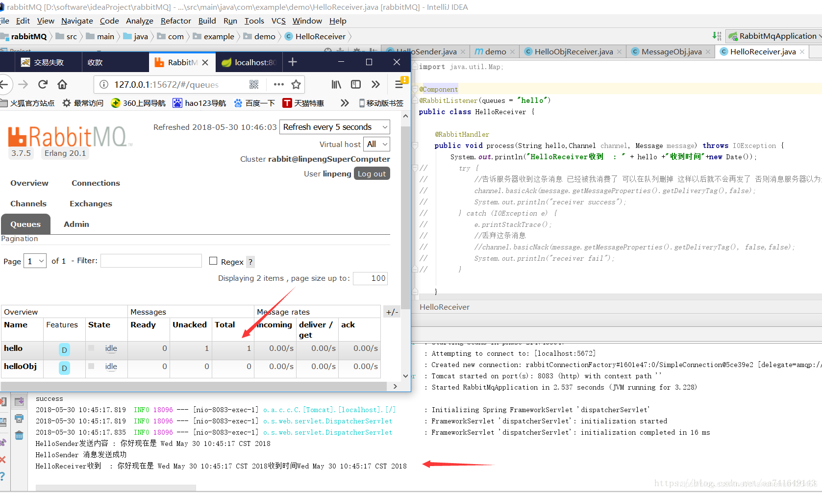 备注:我们用注解的方式来接受消息 就不要用 自己创建对象实现ChannelAwareMessageListener的方式来接受消息 这种方式还要去全局里面配置麻烦,直接用@RabbitListener(queues = "hello")最简单