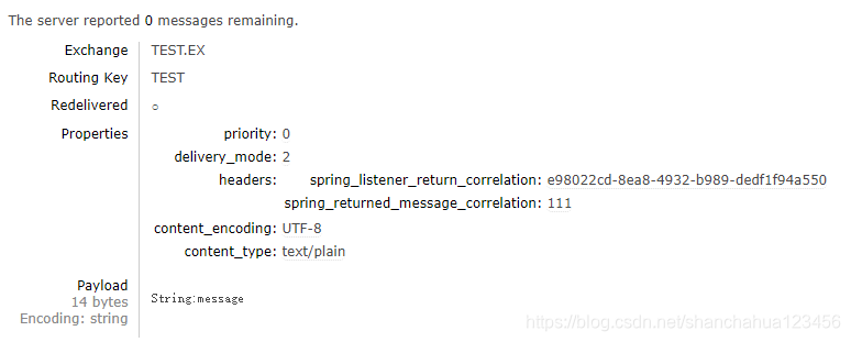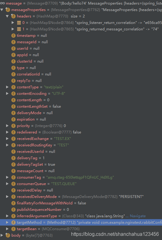 可以看到有消息信息BODY,发送方生成的消息CorrelationData,还有执行的Method对象(@RabbitListener标注的方法),目标BEAN