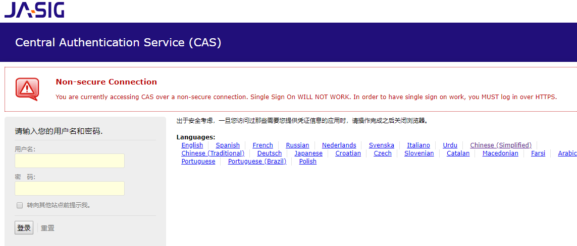 1.WEB-INF/deployerConfigContext.xml中增加参数 p:requireSecure="false" ,是否需要安全验证,即 HTTPS,false 为不采用 如下:< bean class = "org.jasig.cas.authentication.handler.support.HttpBasedServiceCredentialsAuthenticationHandler" p:httpClient-ref = "httpClient" p:requireSecure= "false" />