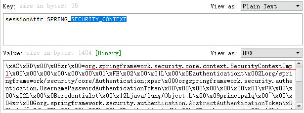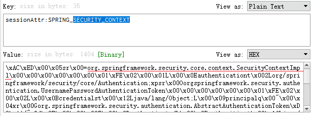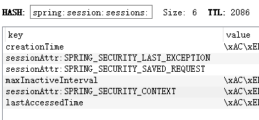 以使用SpringSecurtiy安全框架的项目为例:redis中存储的结构和内容。可以看到session中存储了SpringSecurtiy安全框架中的SecurtiyContext,其中包含用户信息和权限。