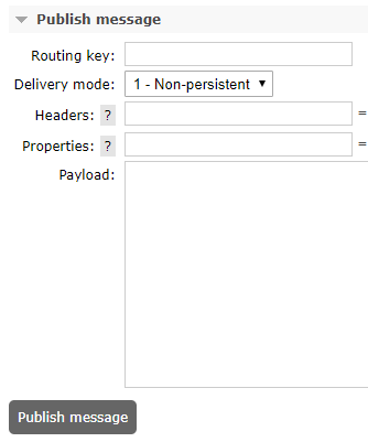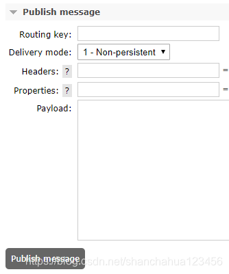 Exchange页面点击相应的交换机,进入交换机信息页面,找到 Publish message,设置 路由键+内容(Payload)发送消息进入此交换机