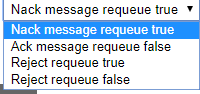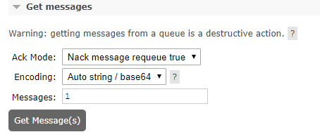 Queues页面点击路由键对应的接收队列(先绑定交换机),进入队列信息页面,找到 Get messages,设置ack模式点击Get message,显示接收的消息内容(四种ack模式依次:Nack+重新入队;ACK;拒绝+重新入队;拒绝+不重新入队)