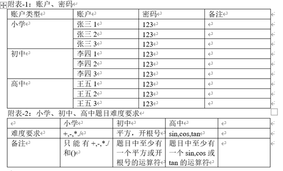 3. 题目数量的有效输入范围是“10-30”(含10,30,或-1退出登录),程序根据输入的题目数量生成符合小学、初中和高中难度的题目的卷子(具体要求见附表)。同一个老师的卷子中的题目不能与以前的已生成的卷子中的题目重复(以指定文件夹下存在的文件为准,见5);