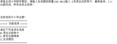 4.在登录状态下,如果用户需要切换类型选项,命令行输入“切换为XX”,XX为小学、初中和高中三个选项中的一个,输入项不符合要求时,程序控制台提示“请输入小学、初中和高中三个选项中的一个”;输入正确后,显示“”系统提示“准备生成XX数学题目,请输入生成题目数量”,用户输入所需出的卷子的题目数量,系统新设置的类型进行出题;