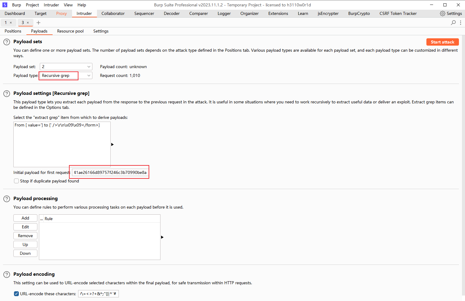 需要修改为单线程,如果未修改会报错:recursive grep payloads cannot be used with multiple request threads。