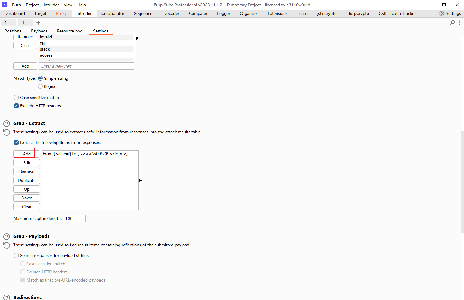 选择 Pitchfork 模式,添加两个 $。第二个选择 recursive grep,从form表单里提取user_token。