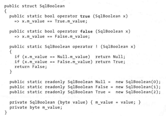 SqlBoolean a=SqlBoolean.Null; if(a) Console.WriteLine("True"); else if(!a) Console.WriteLine("False"); else Console.WriteLine("Null"); //输出为: Null