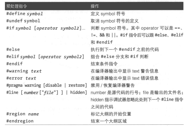 #define DEBUG class MyClass{ int x; void Foo(){ #if DEBUG Console.WriteLine("Testing:x={0}",x); #endif } } // 如果移除了 DEBUG符号,其中的语句就不会编译。
