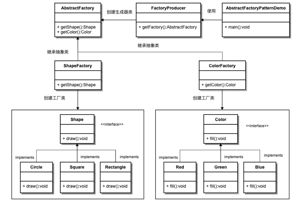 我们将创建 Shape 和 Color 接口和实现这些接口的实体类。下一步是创建抽象工厂类 AbstractFactory。接着定义工厂类 ShapeFactory 和 ColorFactory,这两个工厂类都是扩展了 AbstractFactory。然后创建一个工厂创造器/生成器类 FactoryProducer。