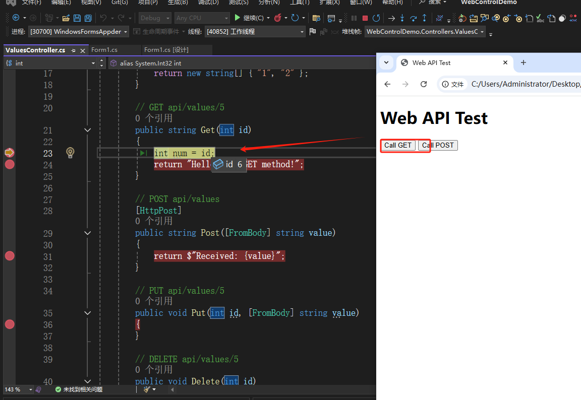 点击web端的Call GET,断点命中Get接口,并将id=6传递,返回“"Hello from GET method!"