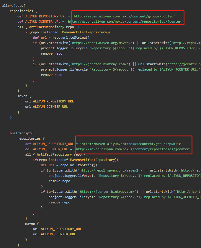allprojects{ repositories { def ALIYUN_REPOSITORY_URL = 'https://maven.aliyun.com/repository/public' def ALIYUN_JCENTER_URL = 'https://maven.aliyun.com/repository/jcenter' all { ArtifactRepository repo -> if(repo instanceof MavenArtifactRepository){ def url = repo.url.toString() if (url.startsWith('https://repo1.maven.org/maven2') || url.startsWith('http://repo1.maven.org/maven2')) { project.logger.lifecycle "Repository ${repo.url} replaced by $ALIYUN_REPOSITORY_URL." remove repo } if (url.startsWith('https://jcenter.bintray.com/') || url.startsWith('http://jcenter.bintray.com/')) { project.logger.lifecycle "Repository ${repo.url} replaced by $ALIYUN_JCENTER_URL." remove repo } } } maven { url ALIYUN_REPOSITORY_URL url ALIYUN_JCENTER_URL } } buildscript{ repositories { def ALIYUN_REPOSITORY_URL = 'https://maven.aliyun.com/repository/public' def ALIYUN_JCENTER_URL = 'https://maven.aliyun.com/repository/jcenter' all { ArtifactRepository repo -> if(repo instanceof MavenArtifactRepository){ def url = repo.url.toString() if (url.startsWith('https://repo1.maven.org/maven2') || url.startsWith('http://repo1.maven.org/maven2')) { project.logger.lifecycle "Repository ${repo.url} replaced by $ALIYUN_REPOSITORY_URL." remove repo } if (url.startsWith('https://jcenter.bintray.com/') || url.startsWith('http://jcenter.bintray.com/')) { project.logger.lifecycle "Repository ${repo.url} replaced by $ALIYUN_JCENTER_URL." remove repo } } } maven { url ALIYUN_REPOSITORY_URL url ALIYUN_JCENTER_URL } } } }