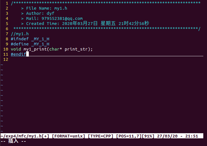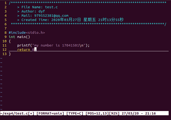我们可以通过vim编辑器编写一个最简单的C语言程序,如写一个输出自己学号的程序。先创建一个文件夹,然后进入该新创建的文件夹。