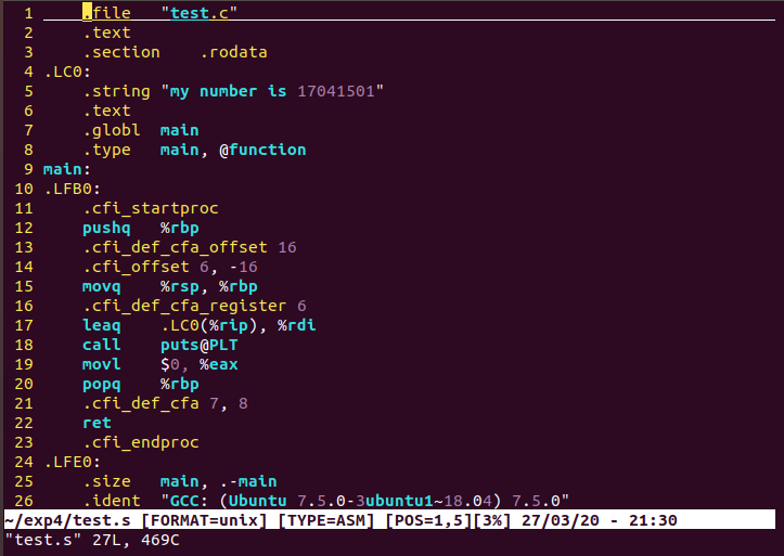 我们可以用vim打开test.s文件来查看内容,也可以用命令,如cat