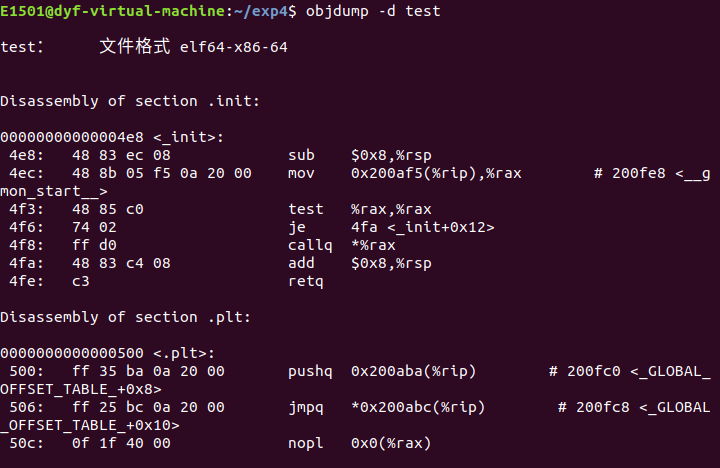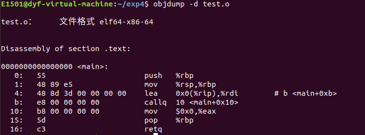 这里生成的不是文本文件了,是二进制文件,我们可以通过objdump命令来反汇编该文件来分析文件内容