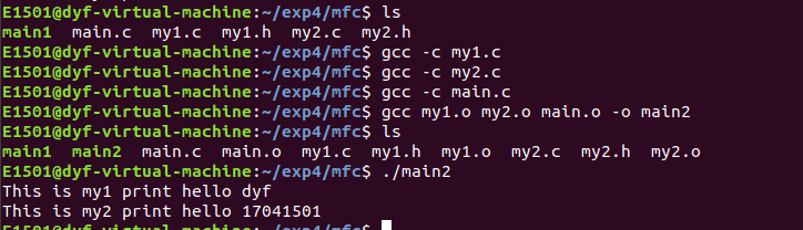 gcc -c my1.c gcc -c my2.c gcc -c main.c是分别将.c文件编译成.o文件,在通过gcc my1.o my2.o main.o -o main2将my1.o、my2.o、main.o链接成main2可执行文件