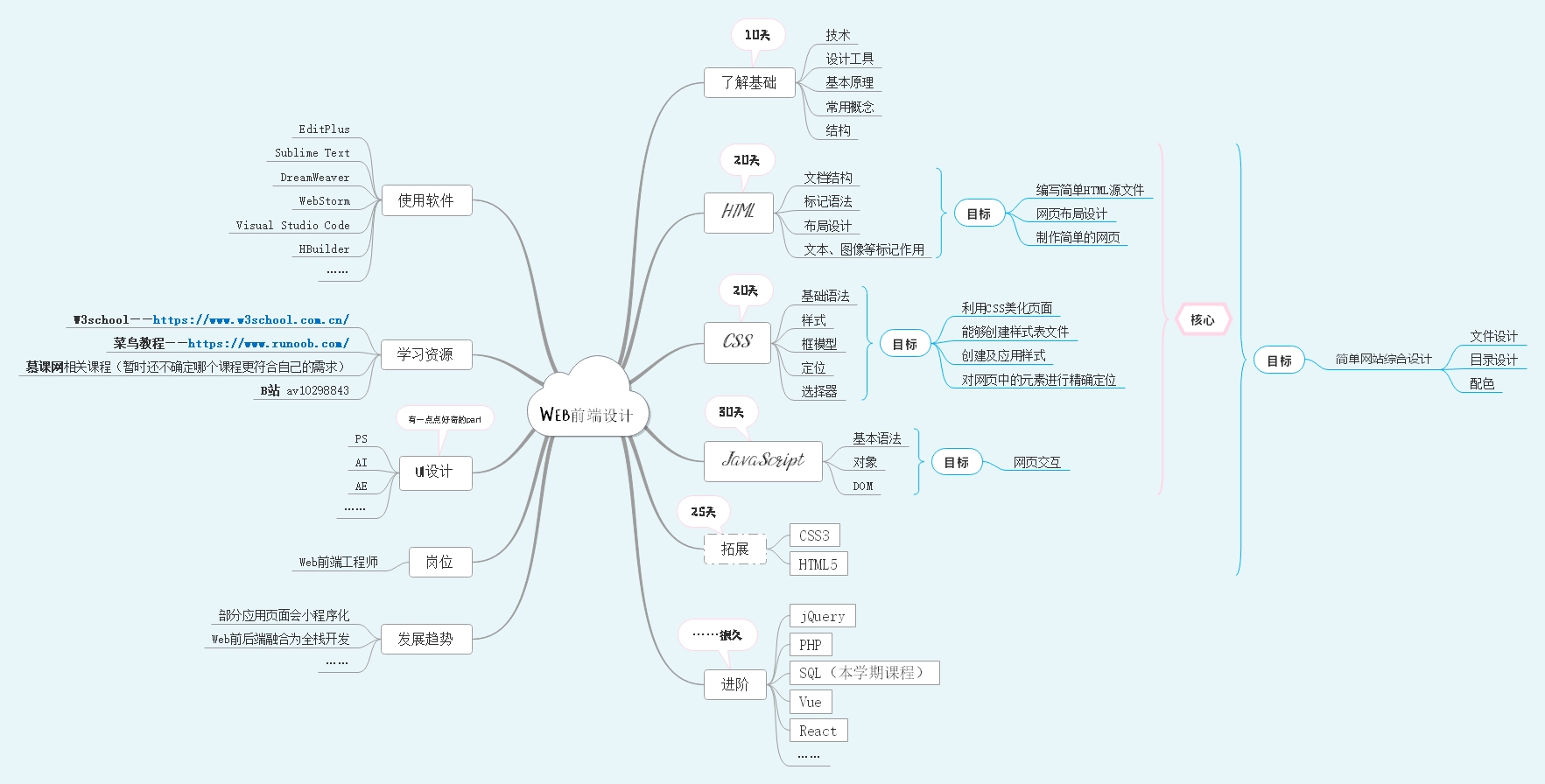 首先,因为在第一次提出目标时没有特别明确地指出自己近期最想要学习的方向,只是粗略地说想要完成学业而已。不过,抛开学业而言,近期个人相对有意向探索的是前端设计这一方面。因此,比起学业涉及的课程,制作了这一方面的路线图,也恰好借这个机会先进行一定的了解。
