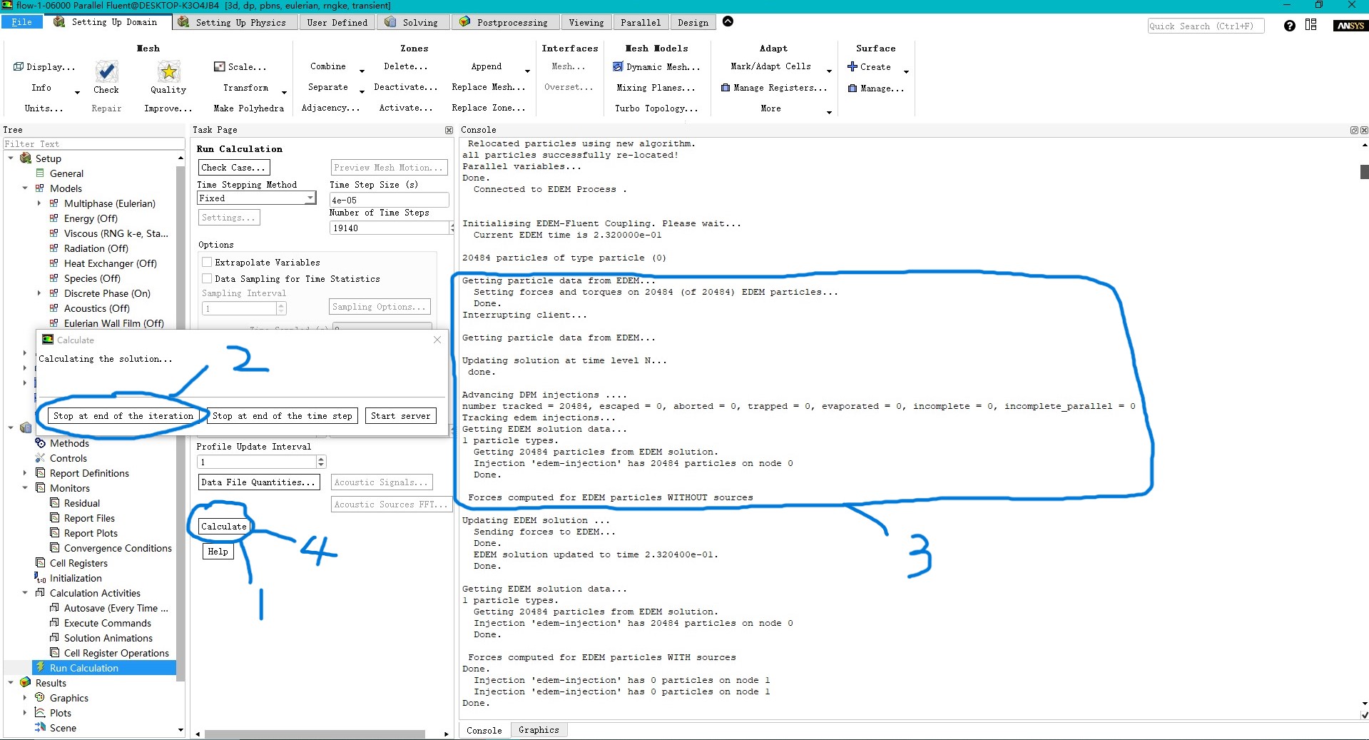 - 进入Fluent的Run Calculation界面,如图所示,先点击Calculation运行一次,当出现图中3所指的信息,点击图中2所指的Stop at end of the iteration,停止迭代,再点击Calculation继续进行计算即可正常计算。