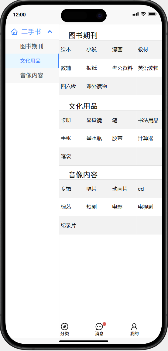 2.点击二手书,进入二手书专区页面;点击数码电器,进入数码电器陈列页面;点击神卷,进入神卷专区。点击左上角小房子可以回到首页。