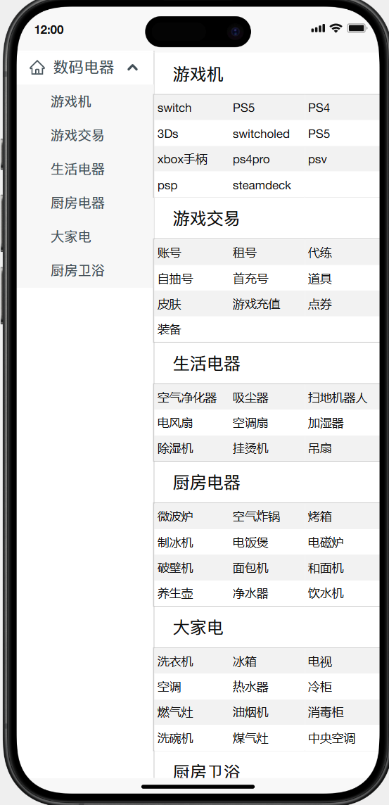 (2)分类页面:为用户提供了系统的商品分类展示,用户可以按照兴趣和需求快速筛选商品。不同的商品分类有清晰标识和特色图标,便于用户识别。进入各分类界面后,用户可以下拉浏览更多商品,彩色部分的醒目展示突出了各分类的特点,方便用户查找特定品类的商品。