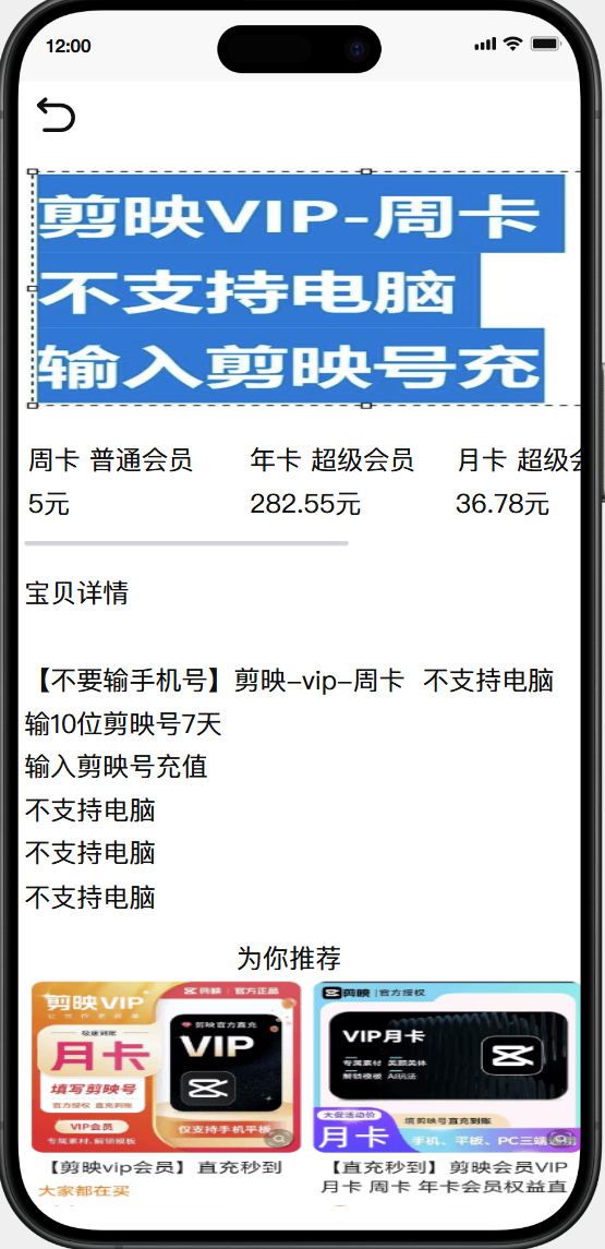 4.点击到具体商品如剪映会员卷,会显示商品详细信息,可加入购物车,可通过左上角返回箭头返回。