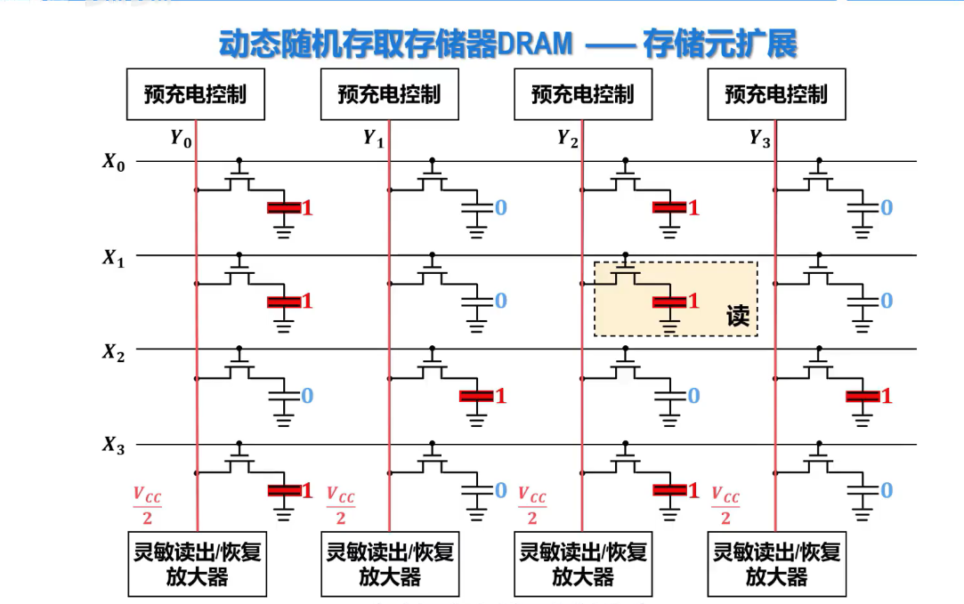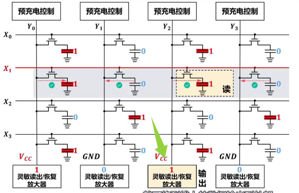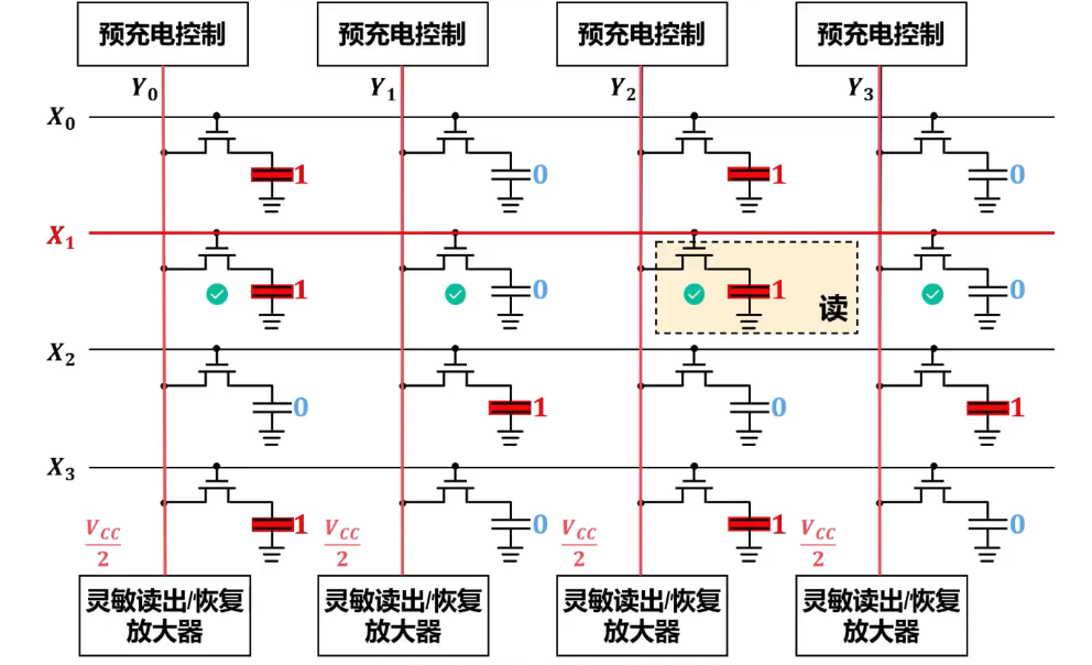 进行读操作时:先对对应的行线输入有效信号,这样会使其mos管导通,其存储电容若充满电,会向列线放电,若未充满电,则列线会对其充电。