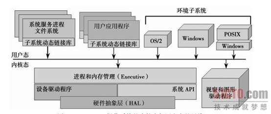 对于文件系统来说,则可以一部分放在用户态,一部分放在内核态。文件系统本身的管理,即文件系统的宏数据部分的管理,必须放在内核态,不然任何人都可能破坏文件系统的结构;而用户数据的管理,则可以放在用户态。编译器、网络管理的部分功能、编辑器用户程序,自然都可以放在用户态下执行。下图描述的是Windows操作系统的内核态与用户态的界线。