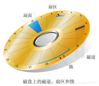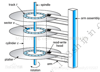 磁盘组合 -> 单个磁盘 -> 某一盘面 (platter)-> 某一磁道 (track)-> 某一扇区(sector)。