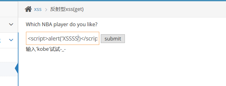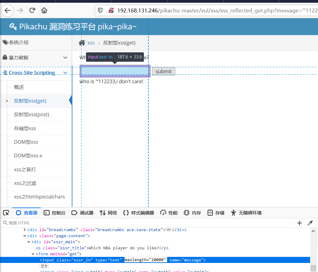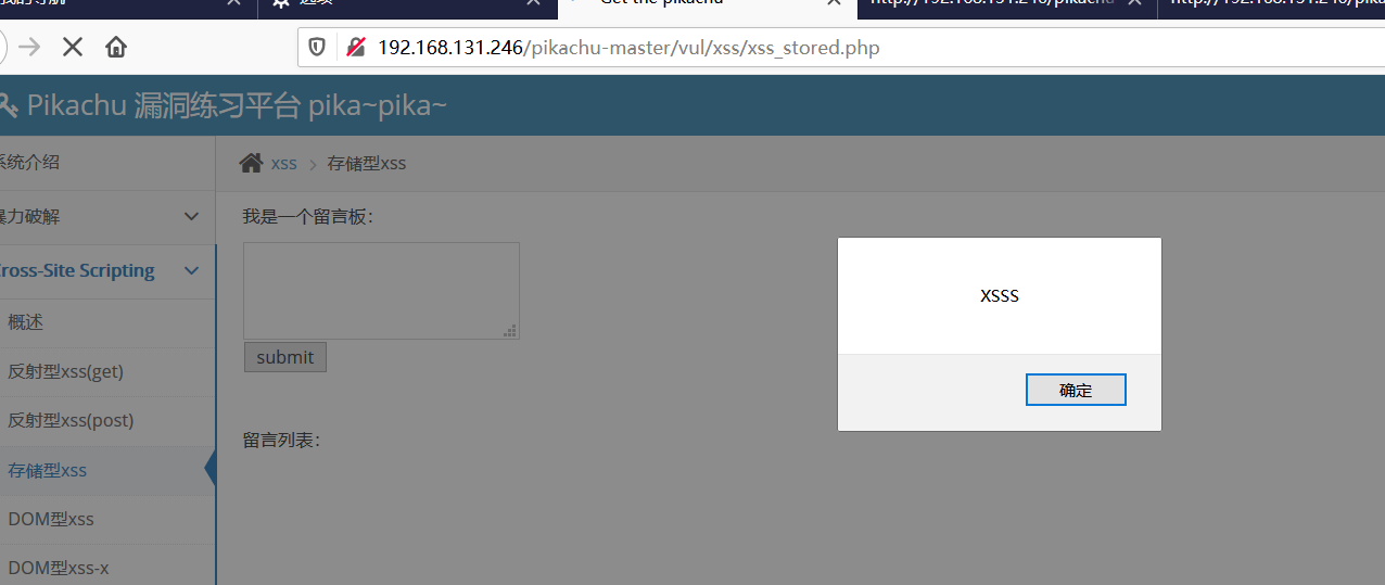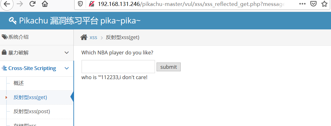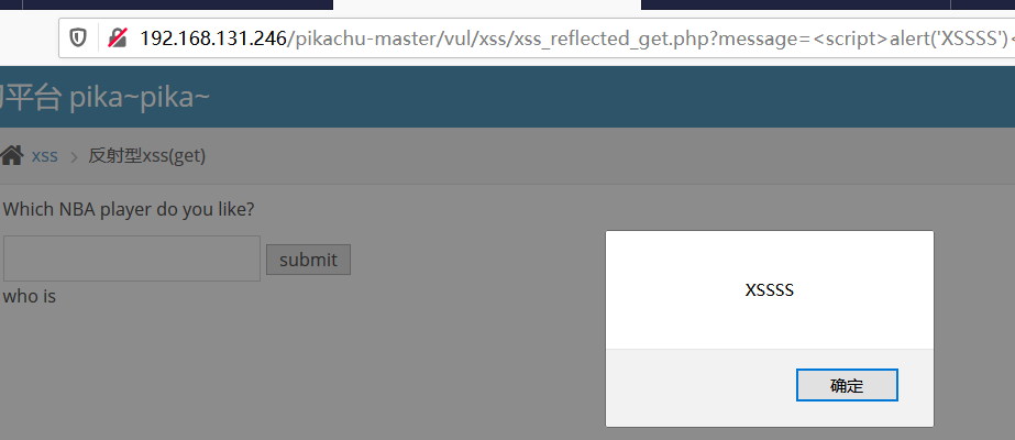 我们发现我刚输入的js代码成功在浏览器中执行,这就是反射型XSS漏洞get型,
