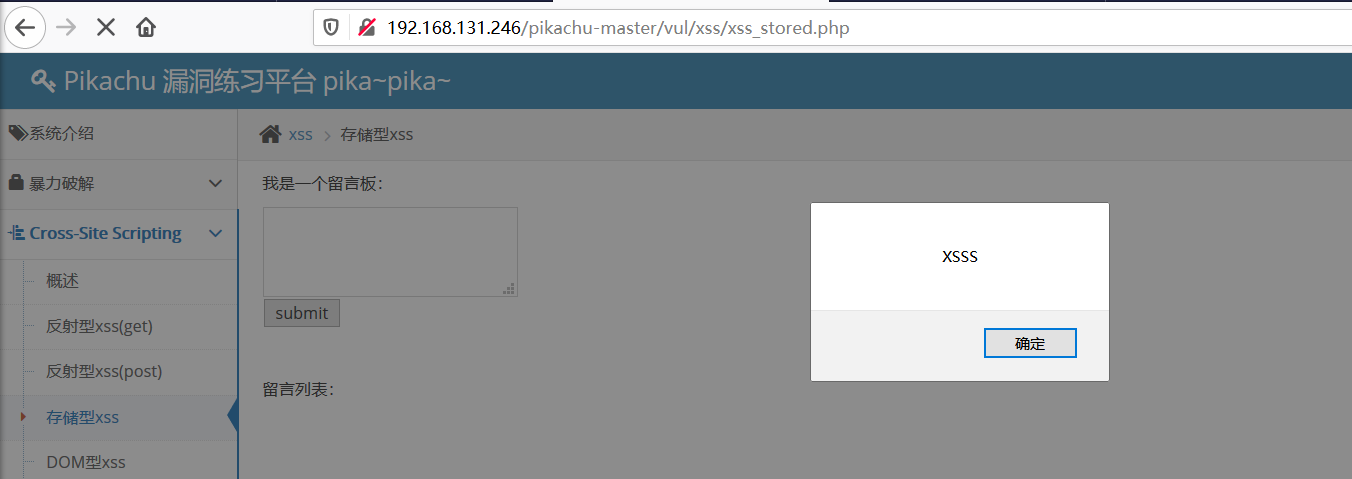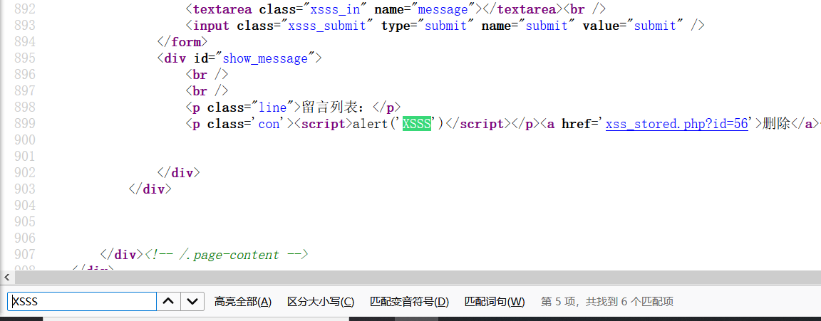 我们发现依然会弹出弹窗,查看页面源码,我们发现输入的脚本被储存进了数据库中,这就是存储型XSS漏洞
