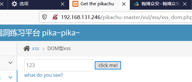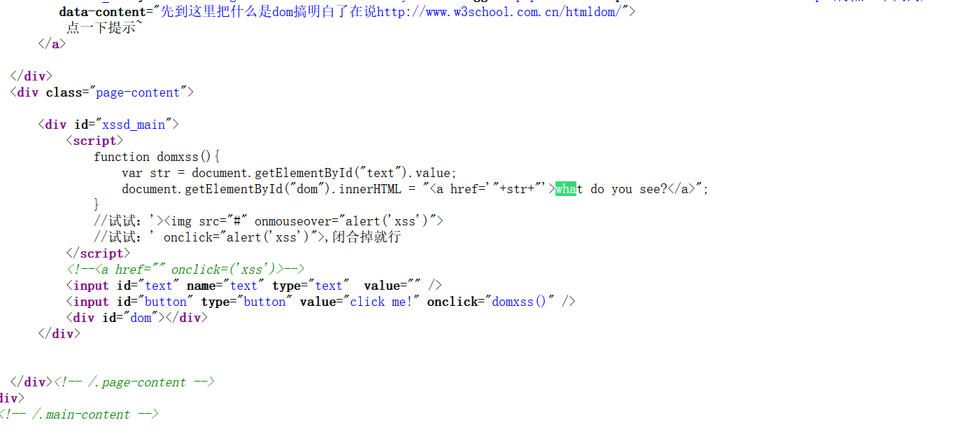 如图输入内容后点击“what do you see”就看到我们输入的js弹框,原理就是我们前端输入的信息被DOM获取进行了相关操作,并从前端输出