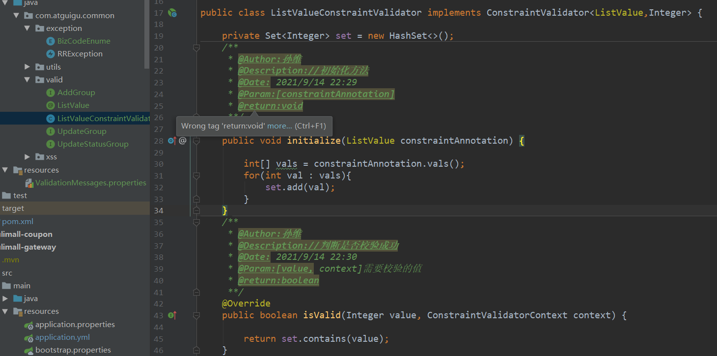 3.然后,自定义一个校验器用来校验你自己需要的规则:这里用set存储请求传入的值,然后在isValid方法里与设置的vals值进行对比校验,然后返回结果(注意:校验器需要在注解那里调用)