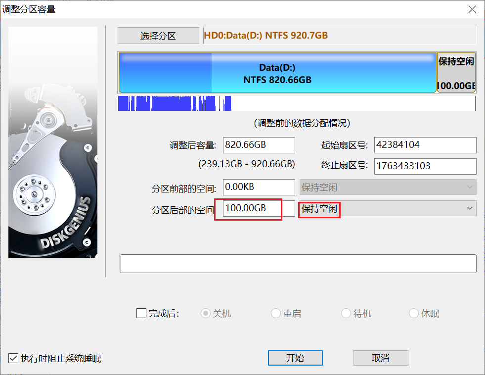 在"分区后部的空间",输入你想加给C盘的空间大小,旁边选择"保持空闲".
