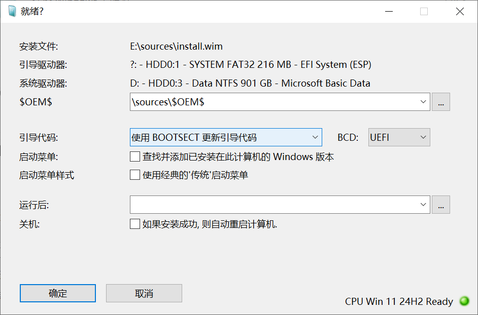 - wimboot:使用wimboot模式安装系统.关于wimboot的详细介绍请在我的公众号主页里搜索wimboot关键字或者查看公众号精选文章.