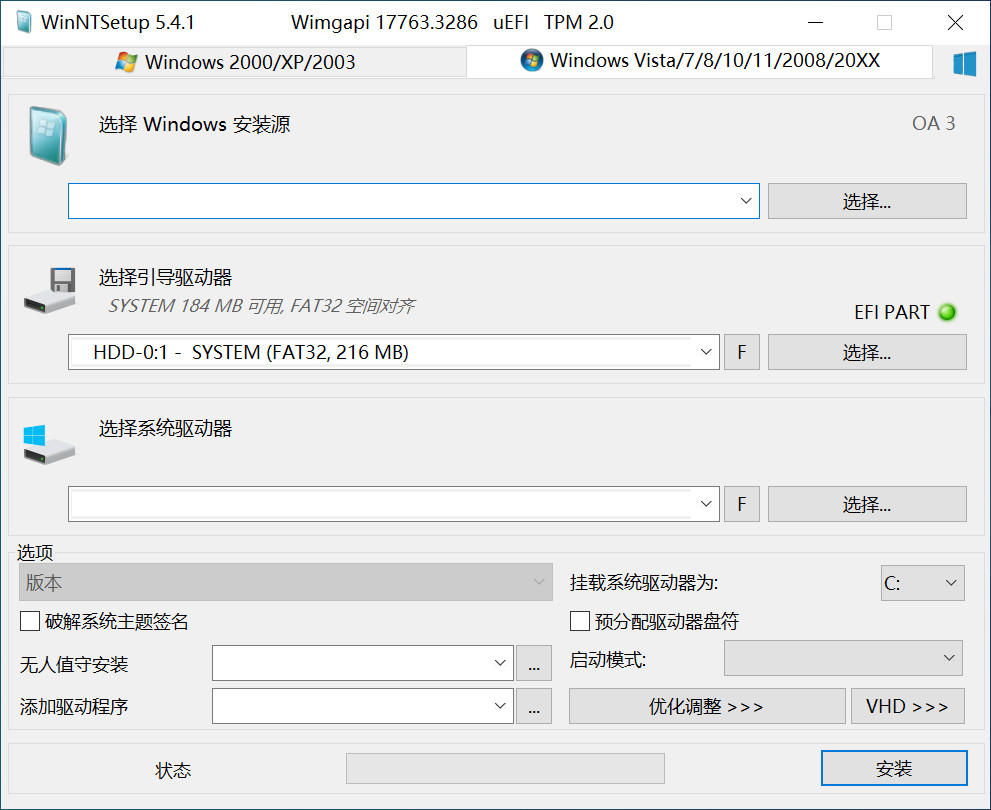 这是winntsetup主界面.winntsetup主界面具体包括两个操作区,上半部分是选择区,下半部分是定制区.