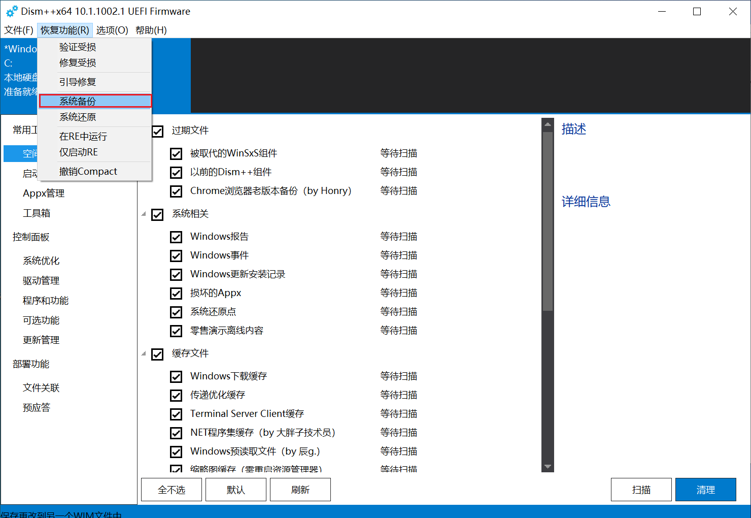 dism++支持热备份,也就是可以在当前系统内备份当前系统.