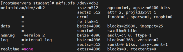 [root@servera student]# mkfs.xfs /dev/vdb2            //这里创建了一个XFS文件系统